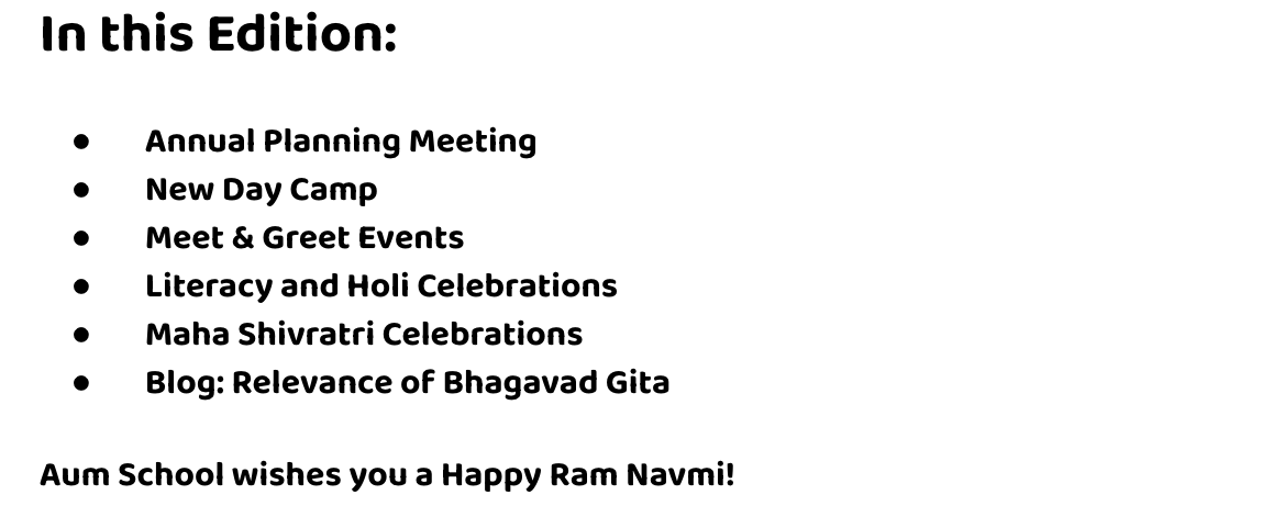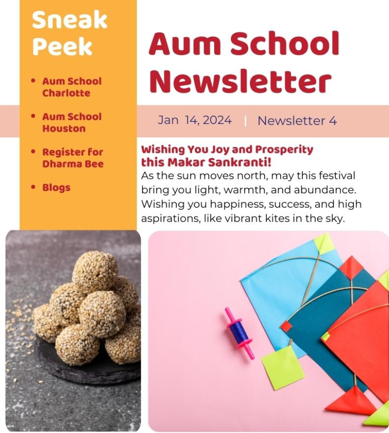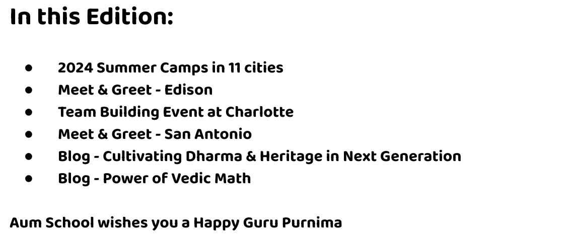 “Aum School Guru Purnima 2025 Newsletter cover featuring a Sneak Peek section, highlights like summer camps, Dharma Bee 2025, and parent voices. The issue honors teachers and volunteers with the headline: ‘Celebrating Guru Purnima and the Summer That Nurtured Our Children.’ Includes photos from Irvine, CA summer camp.”